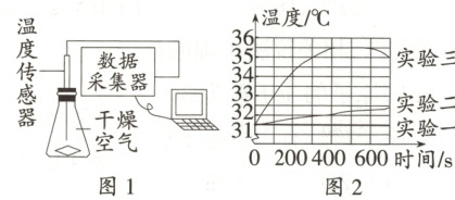 (3)实验二:5g铁粉、1g氯化钠、1.5mL水,具备铁生锈的条件(铁、氧气、水)且铁生锈是缓慢氧化放热的过程,通过题图2可知,实验二温度随时间的增长而升高,证明发生了反应。