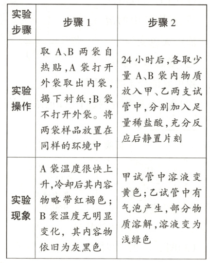 (1)A袋打开外袋,内袋物质与氧气接触,发生铁粉生锈(缓慢氧化)放热;B袋未打开外袋,隔绝氧气,无明显放热,证明铁生锈需要氧气。自热贴发热是由于袋内物质与氧气(或空气)接触。甲试管溶液变黄色,说明A袋中含Fe₂O₃,Fe₂O₃和HCl反应生成FeCl₃,FeCl₃溶液呈黄色;乙试管有气泡产生,溶液变浅绿色,说明B袋含Fe,反应的化学方程式为Fe+2HCl=FeCl₂+H₂↑。