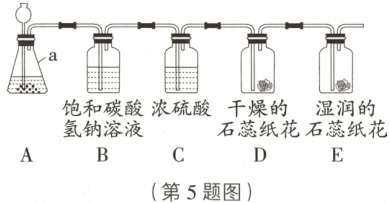 (4)由于酸可使石蕊溶液变红,D中干燥的石蕊纸花不变色,E中湿润的石蕊纸花变红色,对比D、E装置中的现象,可以得出的结论是二氧化碳与水反应生成酸性物质,使石蕊溶液变红。