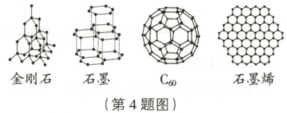 4. 模型建构[人九上 P129、131 原图改编]如图所示为金刚石、石墨、C₆₀、石墨烯的微观结构示意图。