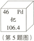 5.B 提示:钯带金字旁,属于金属元素,故A项错误;根据元素周期表中的一格可知,左上角的数字表示原子序数,该元素的原子序数为46;原子中原子序数=核电荷数=质子数=核外电子数,则钯原子的质子数为46,故C项错误;根据元素周期表中的一格可知,汉字下面的数字表示相对原子质量,该元素的相对原子质量为106.4,相对原子质量单位是“1”,常省略不写,故D项错误。