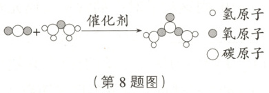 8.C 提示:由分子结构模型可知,反应前后分子种类发生改变,故A项错误;由催化剂的概念可知,反应前后催化剂的质量不变,故B项错误;二氧化碳是由二氧化碳分子构成的,因此保持CO₂化学性质的最小粒子是二氧化碳分子,故D项错误。