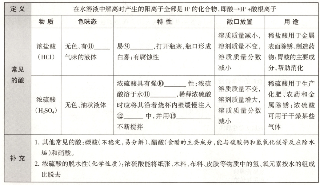⑧ 刺激性⑨ 挥发⑩ 吸水⑪ 放出大量的热⑫ 水⑬ 玻璃棒
