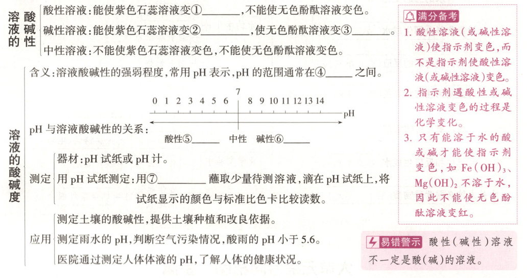 ①红 ②蓝 ③红 ④0~14 ⑤增强 ⑥增强 ⑦玻璃棒