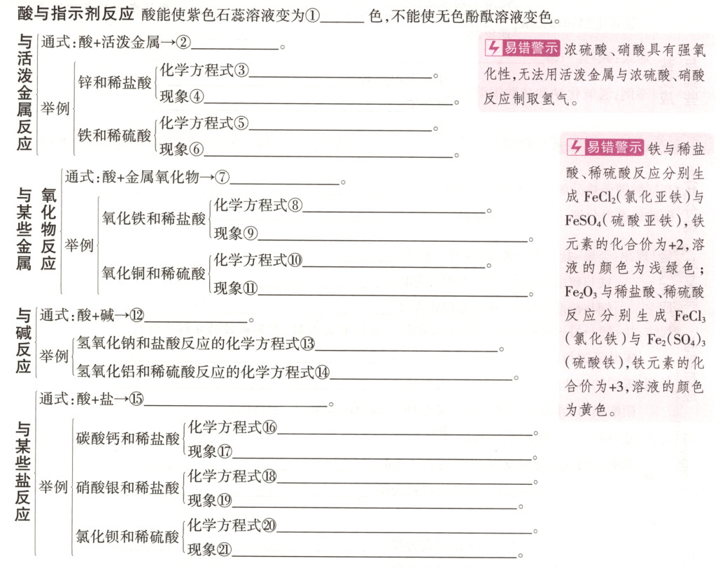 1红 2盐+氢气3Zn+2HCl=ZnCl₂+H₂↑4有气泡产生,固体逐渐减少5Fe+H₂SO₄=FeSO₄+H₂↑6有气泡产生,固体逐渐减少,溶液由无色变成浅绿色7盐+水8Fe₂O₃+6HCl=2FeCl₃+3H₂O9红棕色固体逐渐减少,溶液由无色变成黄色10CuO+H₂SO₄=CuSO₄+H₂O11黑色固体逐渐减少,溶液由无色变成蓝色12盐+水13NaOH+HCl=NaCl+H₂O142Al(OH)₃+3H₂SO₄=Al₂(SO₄)₃+6H₂O15新盐+新酸16CaCO₃+2HCl=CaCl₂+H₂O+CO₂↑17有气泡产生,固体逐渐减少18AgNO₃+HCl=AgCl↓+HNO₃19有白色沉淀生成20BaCl₂+H₂SO₄=BaSO₄↓+2HCl21有白色沉淀生成