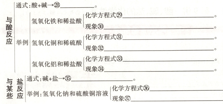 22蓝 23红 24盐+水252NaOH+CO₂=Na₂CO₃+H₂O26Ca(OH)₂+CO₂=CaCO₃↓+H₂O27有白色沉淀生成 28盐+水29Fe(OH)₃+3HCl=FeCl₃+3H₂O30红褐色固体逐渐减少,溶液由无色变成黄色31Cu(OH)₂+H₂SO₄=CuSO₄+2H₂O32蓝色固体逐渐减少,溶液由无色变成蓝色333HCl+Al(OH)₃=AlCl₃+3H₂O34白色固体逐渐减少35新碱+新盐362NaOH+CuSO₄=Cu(OH)₂↓+Na₂SO₄37有蓝色沉淀生成即学即练1二氧化碳小实例辨析浓盐酸 烧碱、生石灰