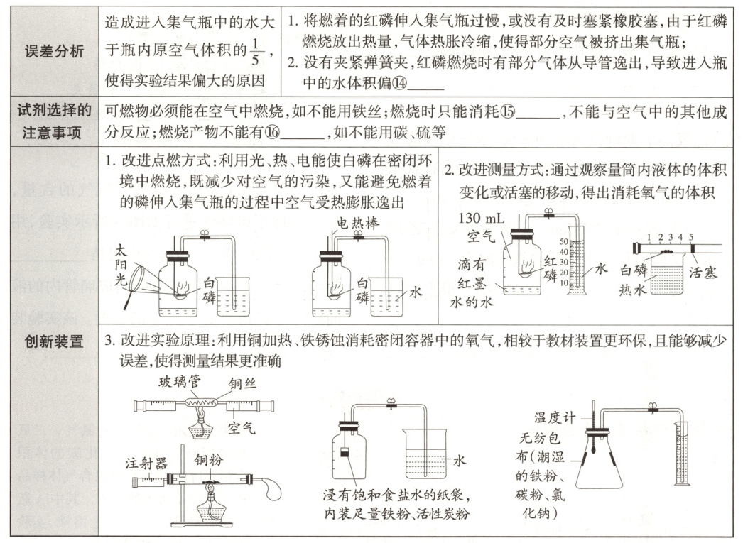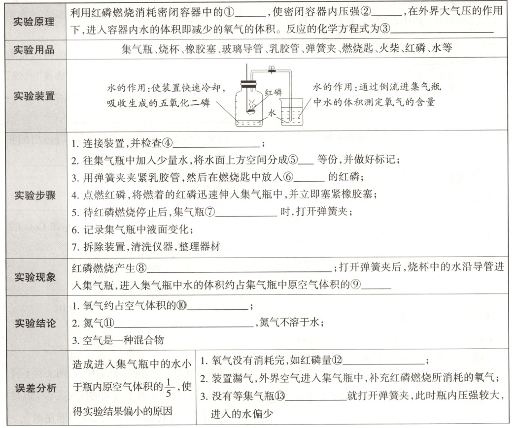 ①氧气 ②减小$ ③4P+5O₂\stackrel{点燃}{=}2P₂O₅ ④$装置气密性 ⑤5 ⑥足量 ⑦冷却至室温 ⑧大量白烟,放出热量$ ⑨\frac{1}{5} ⑩\frac{1}{5} ⑪$不能燃烧也不支持燃烧 ⑫不足 ⑬冷却至室温 ⑭大 ⑮氧气 ⑯气体