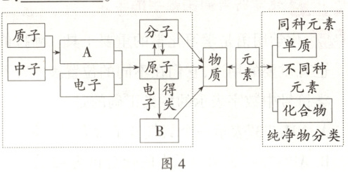 (7)用粒子名称完成物质组成、结构和分类的概念关系图中的 A、B 处填空。A: