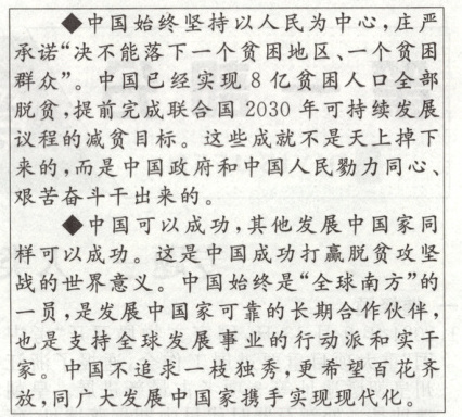 (2)①中国梦的本质是国家富强、民族振兴、人民幸福。实现中国梦就是要实现国家富强、民族振兴、人民幸福。中国梦把国家的追求、民族的向往、人民的期盼融为一体,体现了中华民族和中国人民的整体利益,是中华民族团结奋斗的最大公约数和最大同心圆。中国始终坚持以人为中心,履行庄严承诺,提前完成了联合国2030年可持续发展议程的减贫目标。
