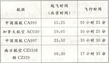 12.B 由材料可知,旅行社在当地时间19:00左右在温哥华机场接机,温哥华位于西八区(当地钟表往前拨快1小时),即接机时间为西八区的18:00,北京位于东八区,北京时间比温哥华时间早16小时,接机时北京时间应该为(18+16)时,减去表中所示的飞行时间即为飞机大致的起飞时间,经过估算,与中国国航CA997起飞时间最为接近(18+16)时—10小时30分=23:30,与B项最接近。
