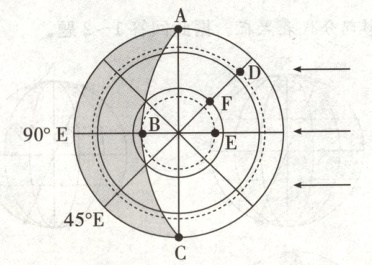 (3)题,E点所在经线为太阳直射点所在经线,地方时为12时,C点是昏线与赤道的交点,地方时为18时。