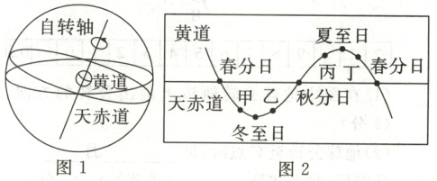 1.D 6月初,地球运行到夏至日附近,从图2上看,此时太阳在黄道上的位置靠近丁位置,D正确。