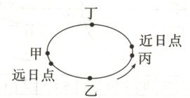 3.B 读图可知,甲为夏至(6月22日前后),乙为秋分(9月23日前后),丙为冬至(12月22日前后),丁为春分(3月21日前后)。根据地球经过近日点(1月初)、远日点(7月初)的时间及北半球二分二至日的时间判断,我国国庆节期间,地球运行在公转轨道的乙、丙之间,B正确。