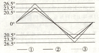 (2)23.5° 黄赤交角 太阳直射点在南北回归线之间做回归运动(3分)