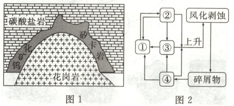 6.C 结合上题可知,矽卡岩属于变质岩,在图2中,由碎屑物质不断固结成岩形成沉积岩(④),最终所有箭头指向岩浆(①),由岩浆冷却凝固形成岩浆岩(②),岩浆岩和沉积岩可以通过变质作用形成变质岩(③),C正确。