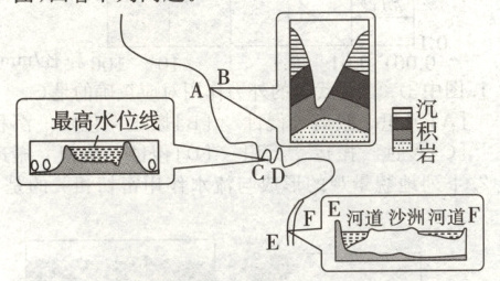 (3)F岸。判断依据:EF河段河道平直,受地转偏向力影响,北半球河水右偏,右(E)岸受到的侵蚀作用较强,左(F)岸受到的堆积作用较强。(6分)