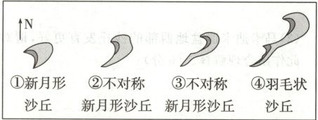 4.C 沙丘主要是由外力作用形成的,而地壳抬升是内力作用,A错误;此处盛行风主要是偏东风,并且缓坡朝向没有发生改变,判断盛行风向没有发生突变,B错误;如果遇到阻碍,局部地区风力受到阻挡,风速降低,流沙沉积,从而覆盖形成羽毛状沙丘,C正确;由图可知,羽毛状沙丘两侧特别是北侧沙丘很宽厚,D错误。