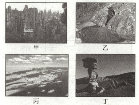 1.D 读图并结合所学知识可知,甲为喀斯特地貌、乙为冲积扇、丙为雅丹地貌、丁为风蚀柱,其中丙、丁为风蚀地貌,D正确。