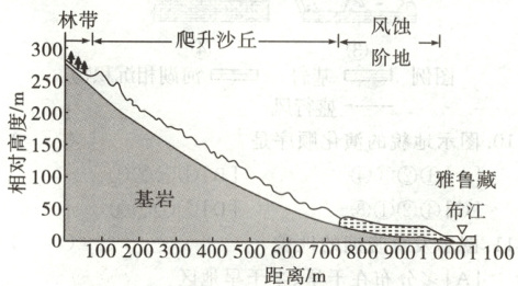 西藏米林的爬升沙丘地处青藏高原东南部,雅鲁藏布江旁。该地区夏季降水丰富,冬春季节降水少,多大风天气,大风经过江面容易形成涡旋上升气流。下图为米林爬升沙丘剖面图。据此回答 5~6 题。