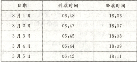 天安门广场国旗的升降时间,是根据北京的日出日落时间确定的,具体时间由北京天文台的天文学家专门计算。早晨,当太阳的上部边缘与天安门广场所见地平线相平时,为升旗时间,日期不同,国旗的升降时间也有所差异。遇到阴天、雨天和雪天,升旗和降旗的时间与前一天相同。下表为2025年3月1日到5日的北京天安门升降旗时间表。