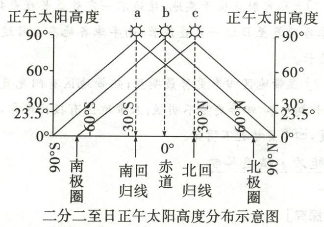 所在纬度向南北两侧递减。具体变化如表所示。[特别提醒] 正午太阳高度的大小