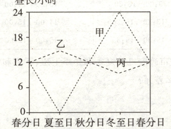 1.B 由图可知,甲地夏至日刚好出现极夜,冬至日刚好出现极昼,处于南极圈上。乙地春分日到秋分日昼长大于12小时,秋分日到次年春分日昼长小于12小时,应位于北半球。丙地全年昼长为12小时,应位于赤道。因此三地由北向南排列顺序为乙、丙、甲。故选B。