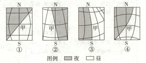 2. 若从甲地垂直上方朝下看,一年中某时刻地面上昼夜状况与经纬线位置关系最有可能是