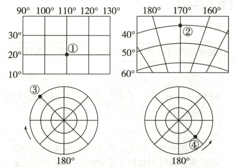 1.C 东西半球的分界线是20°W和160°E经线组成的经线圈,①点经度为110°E,属于东半球;低、中、高纬度的划分界线为30°、60°纬线,②点位于中纬度;根据自转方向为顺时针可知,③点位于以南极点为中心俯视图的赤道上,经度为45°W,位于大西洋;根据自转方向为逆时针可知,④点位于以北极点为中心俯视图的30°纬线上,位于北温带。故选C。