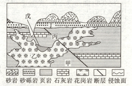 下图为某地地质剖面图,其中丙位于断层线上。读图,回答 1~2 题。