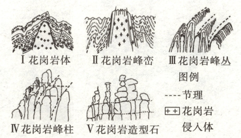 江西三清山是典型的花岗岩地貌。组成该山体的花岗岩水平节理及垂直节理发育,山体演变初期在内力作用主导下形成峰峦,后来外力作用进一步沿节理破坏,逐渐发育成峰丛、峰柱、造型石等微地貌景观。下图为三清山剖面及其演变过程示意。