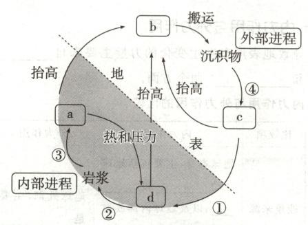 读图可知,b到d的过程为风化物转变为变质岩的过程,是先经历了外力作用,后经过变质作用形成的,岩石性质发生了改变。该过程发生在地表及地球内部,物质来自地表及地球内部,能量来自太阳能和地球内能。