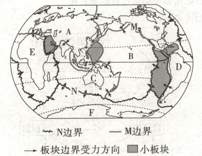 、F为南极洲板块。3. 板块边界类型:图中M为消亡边界,N为