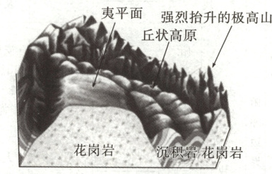 形成过程:青藏高原隆起形成高大山脉,受流水和冰川作用形成高山峡谷;随着流水和冰川的持续作用,河流上游河谷宽缓,两岸形成大面积的冲积平原(准平原);准平原因地壳隆起抬升,受外力侵蚀,留下近似平整的地面,即夷平面形成。