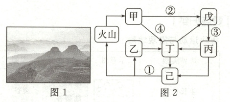 山东省临沂市蒙阴县境内的岱崮地貌分布普遍,有上百座有名有号的崮。崮又称“方山”或“桌状山”,具有山顶平坦开阔,四周峭壁陡立、峭壁以下陡坡逐渐由陡到缓的形态特点。崮顶之下梯田层层,沟壑舒展。崮的岩石中普遍含有三叶虫化石。图1为岱崮地貌景观图,图2为三大类岩石转化示意图(图中甲~己表示三大类岩石以及岩浆、沉积物)。据此回答1~2题。