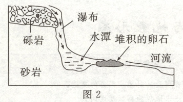 (2)河床受到冲刷被侵蚀,而下部较软的岩层先被侵蚀;崖壁上部岩石在重力作用下坍塌,导致壶口瀑布后退。