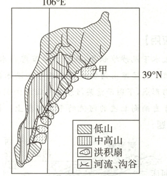 洪积扇是河流侵蚀沟床、沟坡,将大量的碎屑物质搬运到沟口或山坡低平地带,因流速减小,水流搬运能力降低,而迅速堆积形成的扇状堆积体。下图示意贺兰山东麓洪积扇的分布,除甲地洪积扇外,其余洪积扇堆积物均以砾石为主。