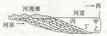 2.A 河流东岸发育形成河漫滩,说明东岸为堆积岸,丙、丁位于堆积岸,流速慢,侵蚀作用弱,C、D错误;西岸为侵蚀岸,侵蚀严重,甲、乙位于西岸,甲位于河流表层,流速最快,侵蚀最强,乙位于河流深处,流速慢,侵蚀相对较弱,A正确,B错误。