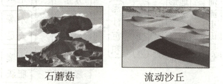 下图为我国某地区常见的石蘑菇和流动沙丘景观图。据此回答1~2题。