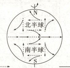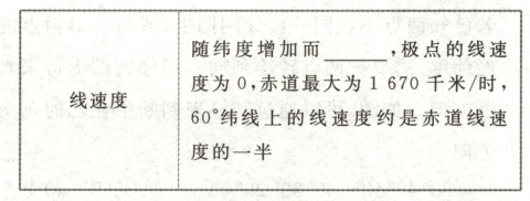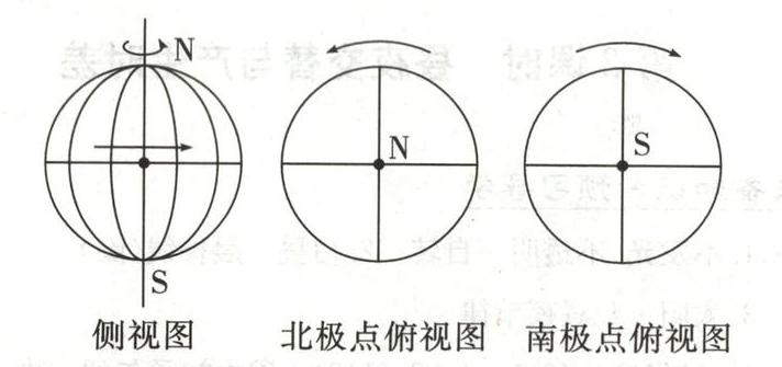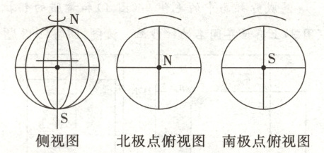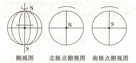 时针方向旋转。② 在下面三幅图中的弧线或短线上标注箭头,表示地球的自转方向。
