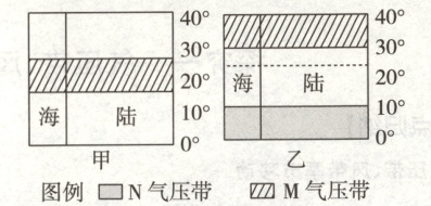 2.B 从图中可知,甲表示北半球冬季,为1月份;乙图30°N~40°N受副热带高气压带控制,为北半球夏季,为7月份。