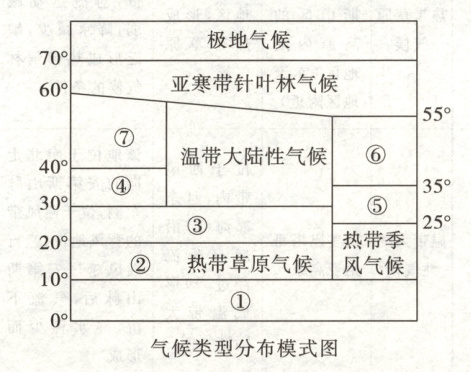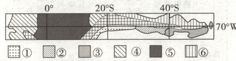 2.D 结合图中经纬度信息可以判断该区域位于南美洲,①为热带沙漠气候,南北跨越的纬度很大,其主要原因是受到秘鲁寒流降温减湿的影响而向低纬度方向延伸,D正确;①气候类型南北跨越的纬度很大与所在陆地南北跨度大无关,A错误;东部高大山脉阻挡是①气候类型不能向内陆延伸的原因,B错误;①气候类型南北跨越的纬度很大与副热带高气压带强盛无关,C错误。