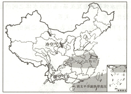 [典例] 长江中下游地区的“梅雨”一般在6月中旬开始、7月中旬结束,但2020年却表现出“来得早、退得晚,极端降水事件频发”的特点,出现了“超级暴力梅”。下图示意长江中下游地区“梅雨”成因。据此回答1~2题。