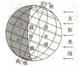 ,称为昼半球;背着太阳的半球是黑夜,称为夜半球;昼半球与夜半球的分界线,称为晨昏线(圈)