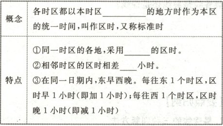 ③ 在同一日期内,东早西晚。每往东1个时区,区时早1小时(即加1小时);每往西1个时区,区时晚1小时(即减1小时)|