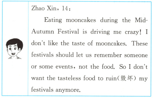 In China, people always connect festivals with different kinds of food. At the Lantern Festival, they will eat yuanxiao or tangyuan. At the Dragon Boat Festival, they will eat zongzi. But when the Mid - Autumn Festival comes, some complain that it is a painful thing to eat the food they don't like at such festivals. Do you think we must eat traditional food at traditional festivals? Read the following and know what the students' opinions are.