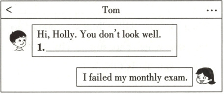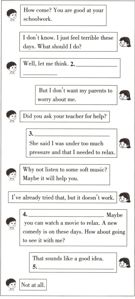 1. What’s wrong? /What’s the matter with you? 2. Why not talk with your parents? /You can talk with your parents. /You can ask your parents for help. 3. Yes, I did. 4. I’m sorry to hear that. 5. Thank you very much.