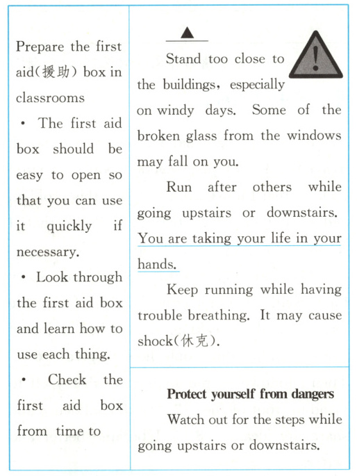Schools always hold a large number of students, and there might be some hidden dangers. So it's best for us to know what to prepare for, how to keep safe and what shouldn't be done to avoid some accidents. The following poster will help you.