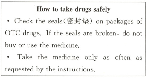 1. Because taking too little of the medicine will not improve our body’s condition, but taking too much can have a bad influence on us. 2. On the packaging of over-the-counter drugs. 3. Sleepiness and nausea. 4. If the seals are broken, I won’t buy or use the medicine. 5. I’ll read the instructions carefully. Because the incorrect use of drugs might have a bad influence on me.(言之有理即可)