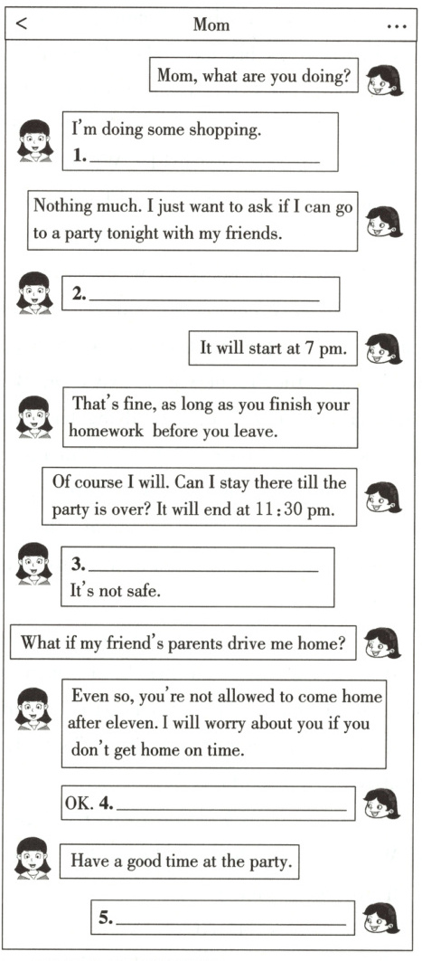 1. What's up? 2. When will it start?/When is it? 3. I'm afraid not./No, you can't. 4. I will come back home on time./I will get home before eleven. 5. Thanks, Mom.