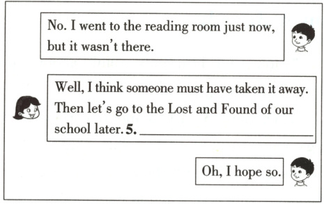 1. What’s the matter?/What’s wrong? 2. Don’t worry. 3. What color is it? 4. Did you leave it there? 5. I think we will find it.